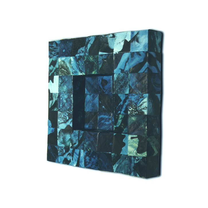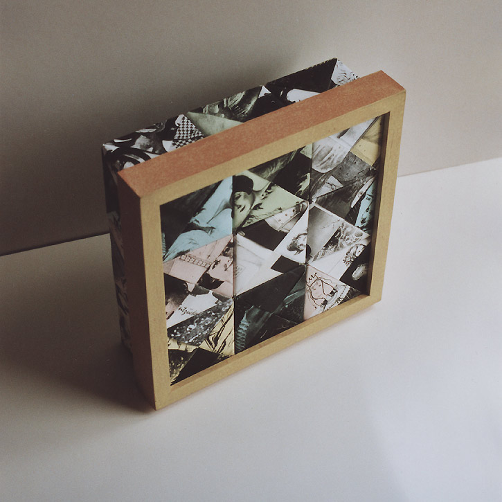 Papier, bedruckt, gefaltet zu 8 drehbaren Würfeln im Holzrahmen.