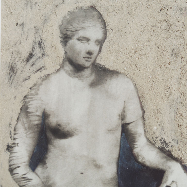 Papier, bedruckt, bemalt; Tusche; Olivenöl; auf Karton; auf Baumwolle.