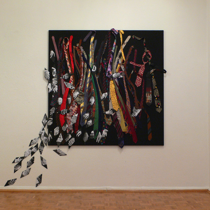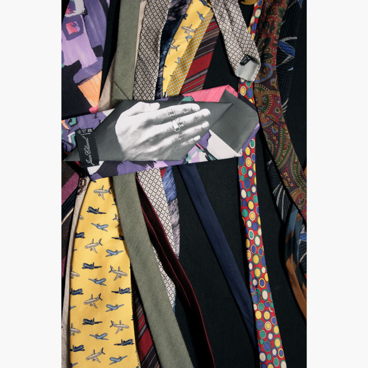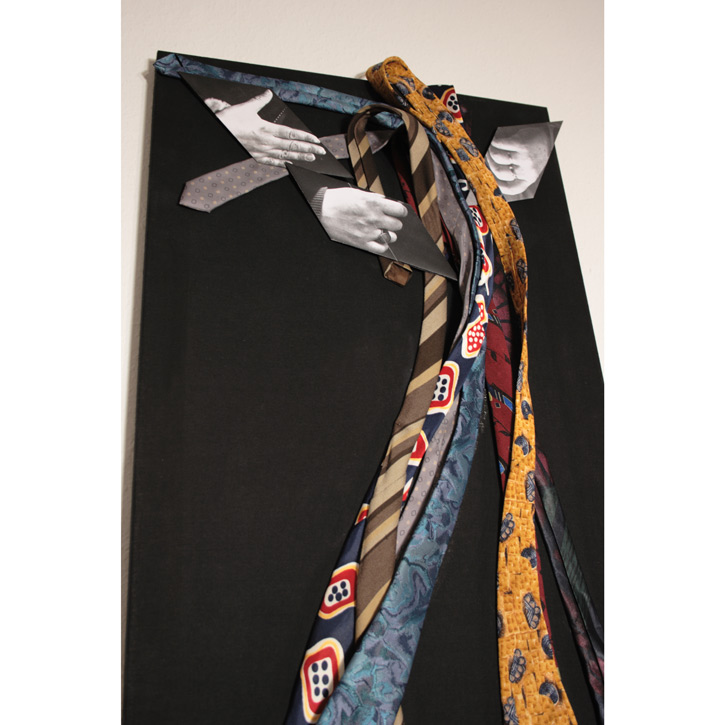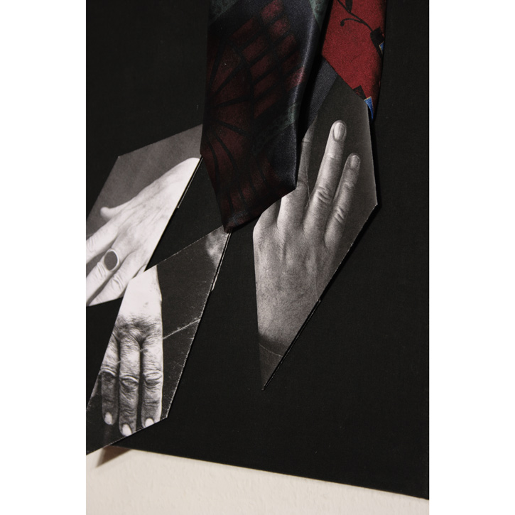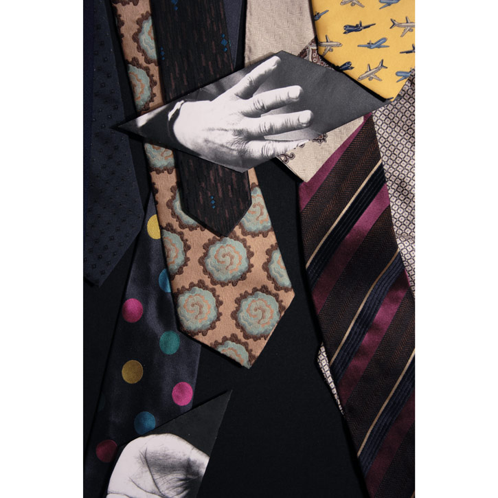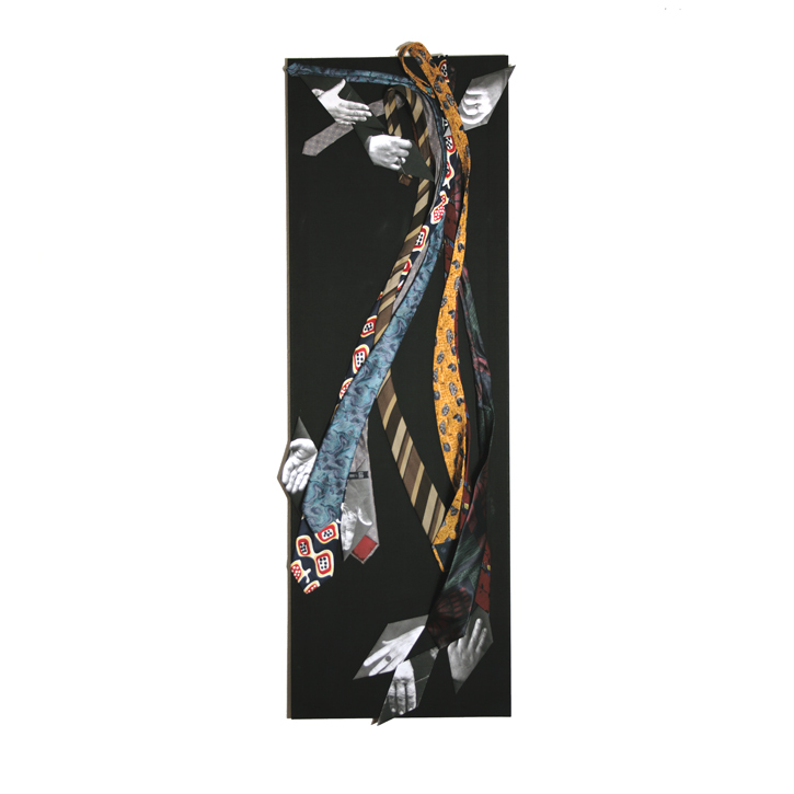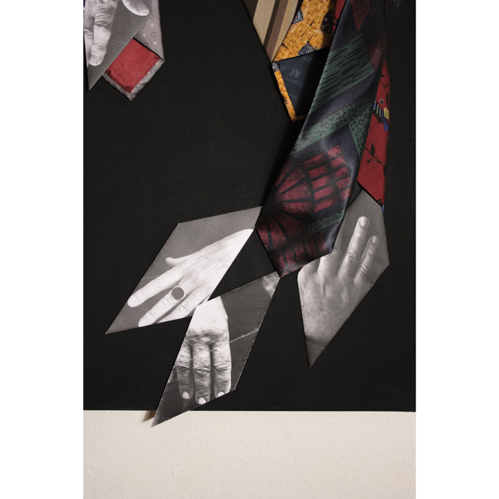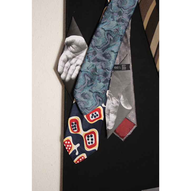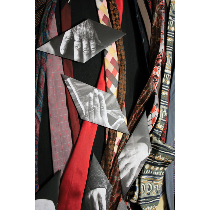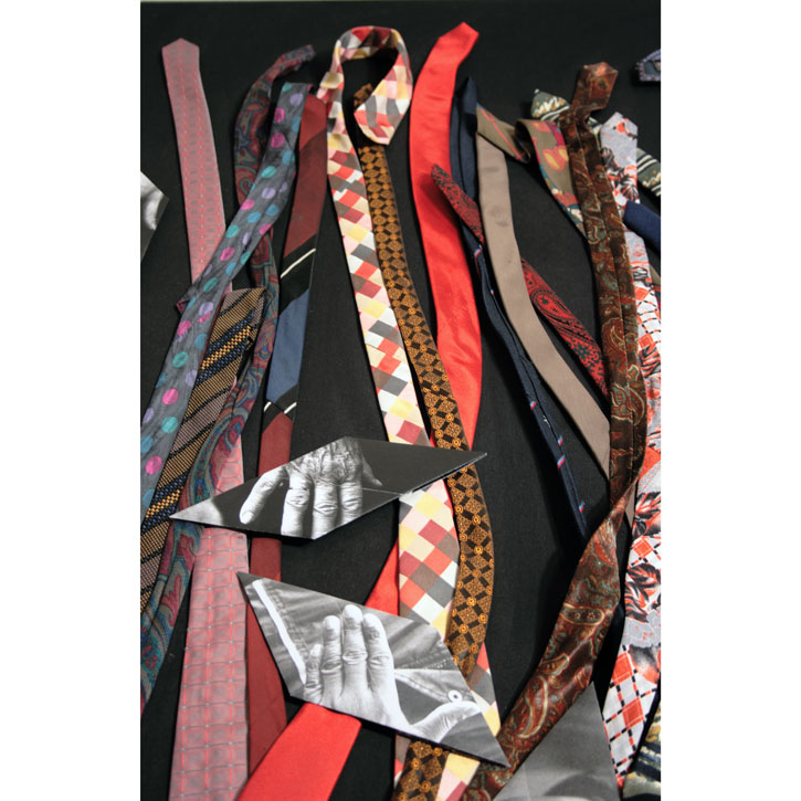 Papier bedruckt, gefaltet; Krawatten, genäht auf Baumwolle.
