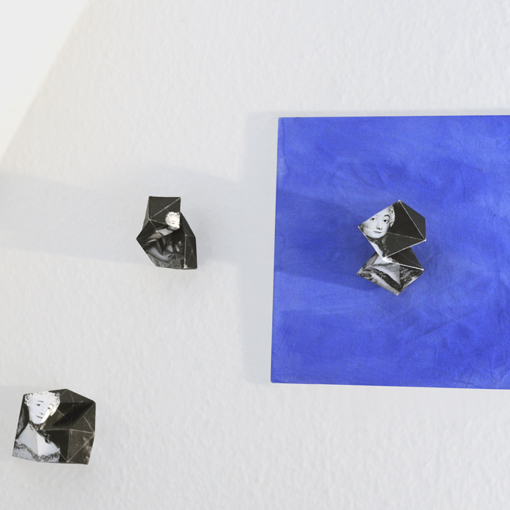 Installation; Papier bedruckt, gefaltet; auf blauer Baumwolle.